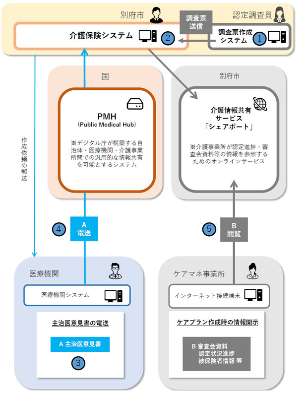 デジタル庁のPMHを活用して主治医意見書を医療機関から別府市へ電送し、調査票作成システムを導入することで、要介護認定に関する一連の業務をデジタル化する実証を実施しました。