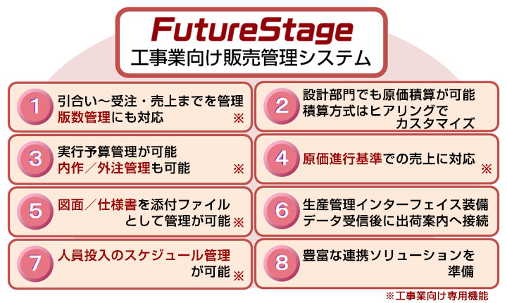 FutureStage 工事業向け販売管理システムは、工事業に特化した販売管理システムです。工事業に必要な専用機能をご提供します。
