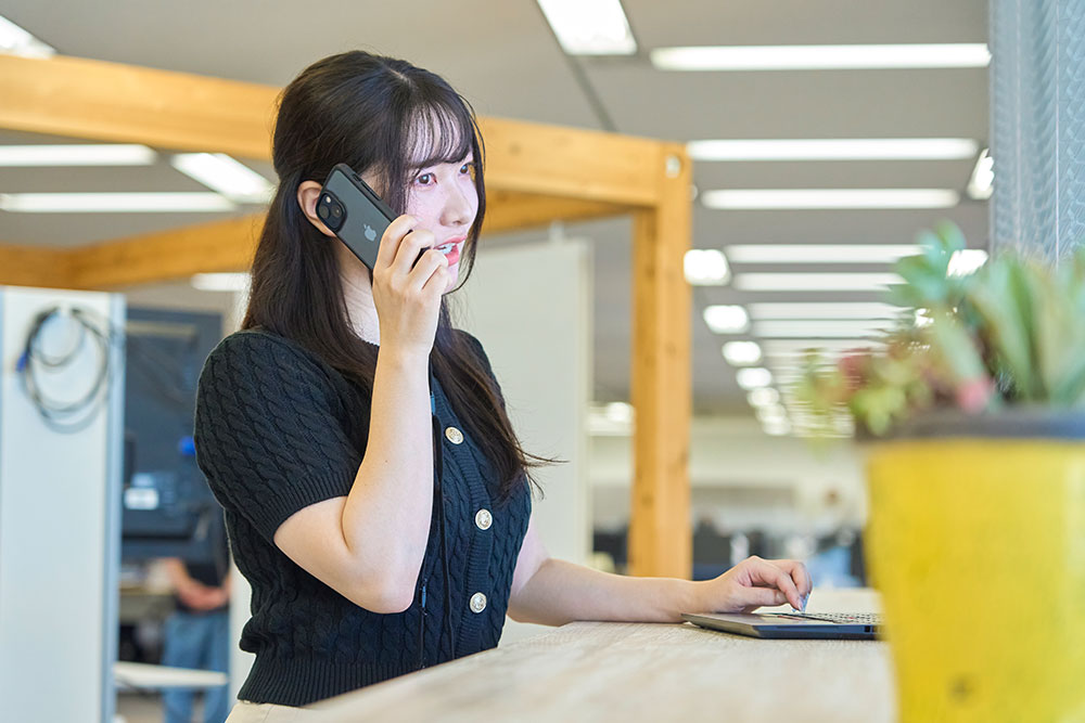 私はインサイドセールスの中でも、当社のホームページから資料請求をしてくださったお客さまにカタログや概要資料などを送付し、その後、電話やメールでオンラインの面会に誘導するようアプローチを行っています。お客さまの検討状況を把握し、抱えている課題を解決するための当社のソリューションを提案します。営業やシステムエンジニアと連携し、受注につなげることができたときは、やりがいを感じます。また、日々自分の知識が増えていくのも、成長が感じられてやりがいになっています。